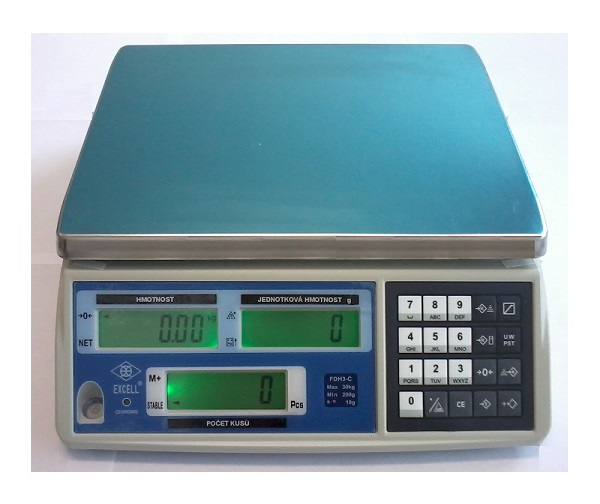 Displej: 3 podsvícené displeje ukazující hmotnost, hmotnost kusu a počet kusů